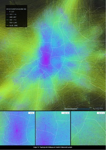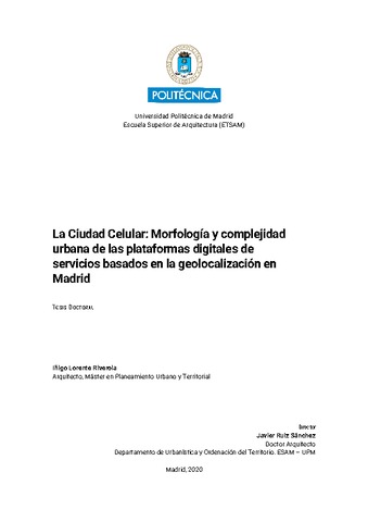 La popularización los servicios digitales basados en la geolocalización (LBS) tras el lanzamiento del smartphone en 2007, hace cada vez más necesaria la toma en consideración de la dimensión informacional de la ciudad en su planificación. Estas aplicaciones articulan el acceso y organización espacial a cada vez más actividades y servicios cotidianos —como descubrir lugares, la movilidad, el comercio, el hospedaje o las relaciones interpersonales—, lo cual contribuye a articular la ‘Ciudad Celular’; donde las funciones y accesibilidad de los lugares materiales, está cada vez más condicionada por la formas y topologías digitales emergentes. Esta tesis explora la integración de los LBS en la ciudad desde la óptica de la complejidad urbana, evaluando si la ciudad ve o no acrecentada su diversidad funcional accesible. Como hipótesis, se plantea que las tramas urbanas más complejas son aquellas más intensamente digitalizadas, resultando en una acumulación desigual de información, comunicaciones y por tanto complejidad urbana. Para testarla se ha contrastado la geografía de un conjunto de LBS —Facebook Places, Foursquare, AirBnB, MyTaxi, Grindr, Wallapop, Amazon Hub— con el plano social y material de Madrid; morfológica y topológicamente. Los resultados ponen de relieve la naturaleza físico-digital de una ciudad contemporánea en la que las diferencias estructurales entre un centro urbano ‘hiper digitalizado’ y su periferia se traducen en un reparto desigual de desafíos y oportunidades, dependientes de la complejidad de la ciudad construida, y de la programación informática de cada servicio; determinante de los intercambios que favorece. Hechos que subrayan la importancia de una planificación sinérgica de la ciudad y las tecnologías emergentes, preservando y favoreciendo su diversidad funcional accesible, tanto física como digitalmente. ----------ABSTRACT---------- The broad adoption of location-based services (LBS) running on smartphones since 2007 requires urban planning to better understand the informational dimension cities have. The number of activities and their traditionally associated places is becoming more uncertain as they become part of a geographic self-regulated cyberspace which imposes its own logics to urban visibility, mobility, commerce, accommodation or interpersonal relationships amidst other parts of everyday life; presenting the ‘Cellular City’ as a digitally-integrated whole. This research explores the Cellular City from the perspective of urban complexity, assessing whether the physical city increases its accessible functional diversity under the action of LBS or not. The hypothesis to stress is that the more complex urban fabric is, the more intense the digitalization of its places will be, resulting in an uneven accumulation of information, communications and complexity. The geography of a representative selection of apps —Facebook Places, Foursquare, AirBnB, MyTaxi, Grindr, Wallapop, Amazon Hub— has been put into contrast with Madrid’s physical morphology and topology to discuss that claim. Results show the hybrid physical and digital nature of contemporary cities, upon which, for the studied case, structural imbalances between a hyper-digitalized center and its periphery produces an unequal distribution of challenges and opportunities related with the complexity of the underlying physical realm and the uncertainty in the communications the LBS may enact. Both facts call for developing synergic planning strategies of the city to preserve and foster its functional and communicative diversity, whether physical or digitally.