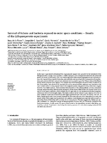 | Título: | Survival of lichens and bacteria exposed to outer space conditions - Results of the Lithopanspermia experiments |