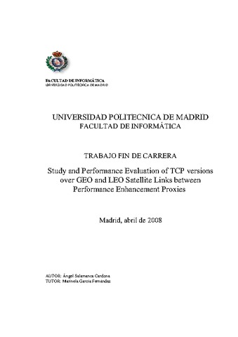 | Título: | Study and Performance Evaluation of TCP versions over GEO and LEO Satellite Links between Performance Enhancement Proxies |
