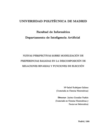 | Título: | Nuevas perspectivas sobre modelización de preferencias basadas en la descomposición de relaciones binarias y funciones de elección. |
