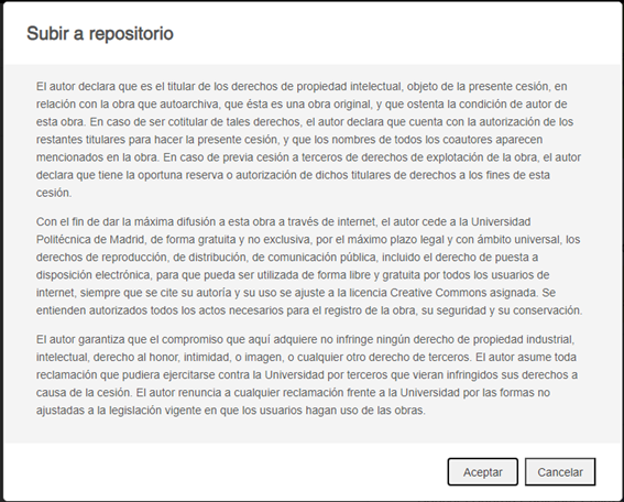 Una vez adjuntado el fichero pincharemos en Subir, que nos presentara las Condiciones de Publicación en el Archivo Digital UPM, que es necesario aceptar para que los metadatos y el PDF se envíen al Archivo Digital para su revisión y publicación: